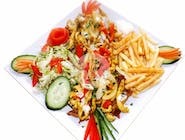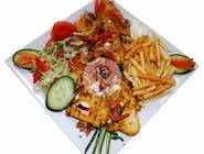 cztery rodzaje mięsa, surówka, sos, frytki/ryż/makaron
