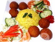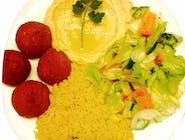 szysz tałuk, kofta, hummus, sałatka, sos, chleb pita -
